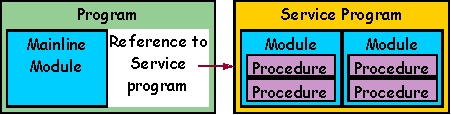 Service programs are a very powerful component of the ILE environment. A service program allows a program to reference a module dynamically rather that statically. A service program is created with the command CRTSRVPGM. One or more modules are used to create a service program. In our example, we're going to create a service program using our one procedure module. We'll give the service program the same name as the module (which has the same name as the source member). The service program will have an object type *SRVPGM. A service program can kind of be thought as a collection of modules, which in turn has a collection of procedures.